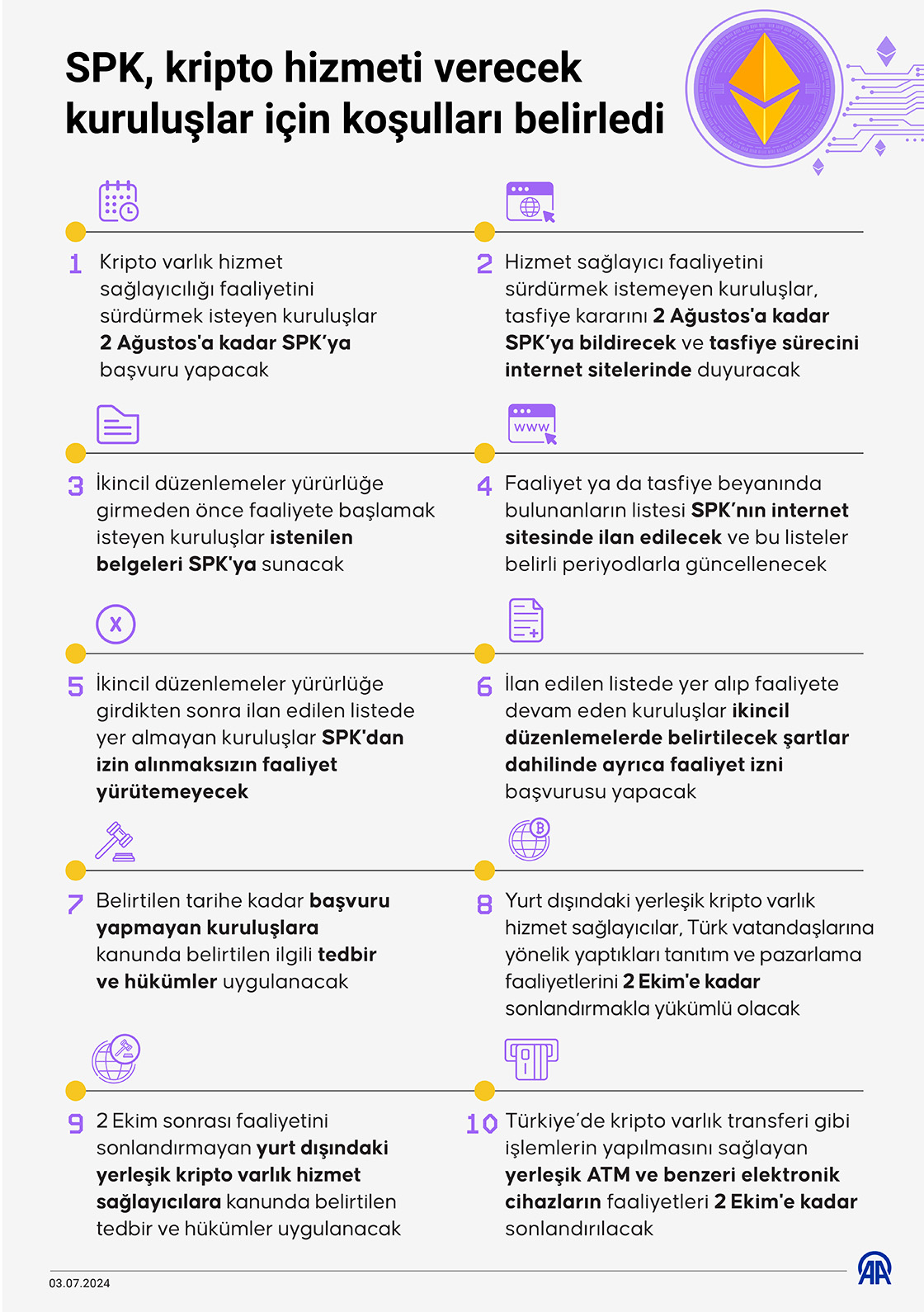 Sermaye Piyasası Kurulu (SPK), kripto varlıklara yönelik düzenlemeleri kapsayan Sermaye Piyasası Kanununda Değişiklik Yapılmasına Dair Kanun'un yürürlüğe girmesinin ardından kripto varlıklara ilişkin sürecin detaylarını açıkladı. (Grafik: Elif Acar/AA)03 Temmuz 2024•Güncelleme: 03 Temmuz 2024