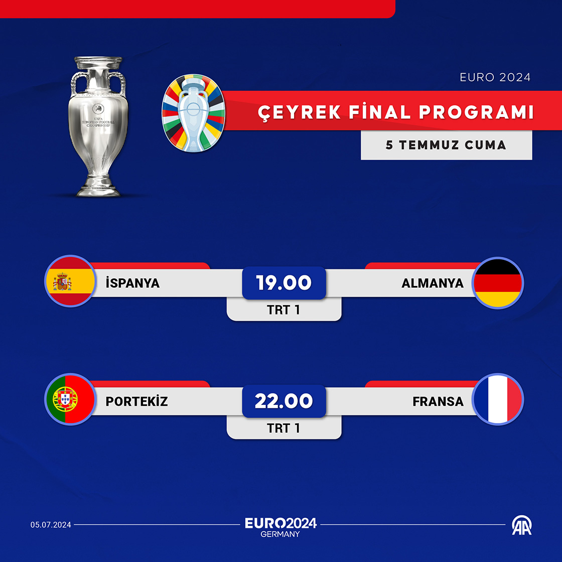 Euro 2024 Avrupa Futbol Şampiyonası çeyrek final maçlarında 19.00'da İspanya ile Almanya, 22.00'de Portekiz ile Fransa karşı karşıya gelecek. (Grafik: Kemal Delikmen/AA)