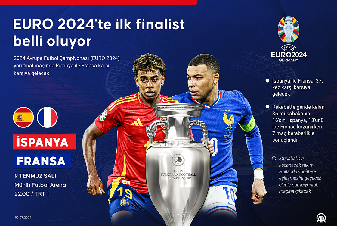 2024 Avrupa Futbol Şampiyonası (EURO 2024) yarı final maçında İspanya ile Fransa karşı karşıya gelecek. (Grafik: Kemal Delikmen/AA)