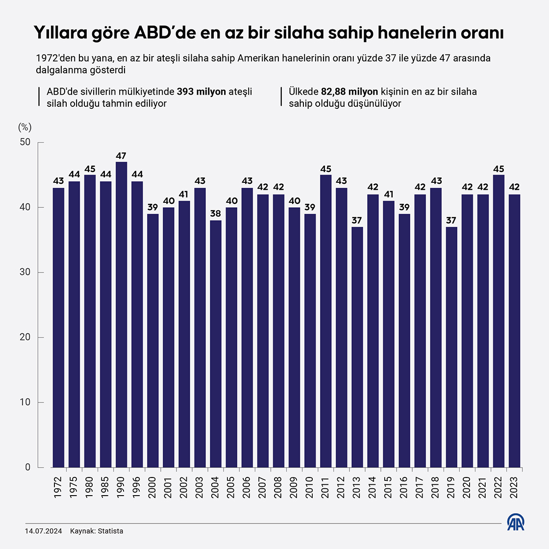 Yıllara göre ABD’de en az bir silaha sahip hanelerin oranı