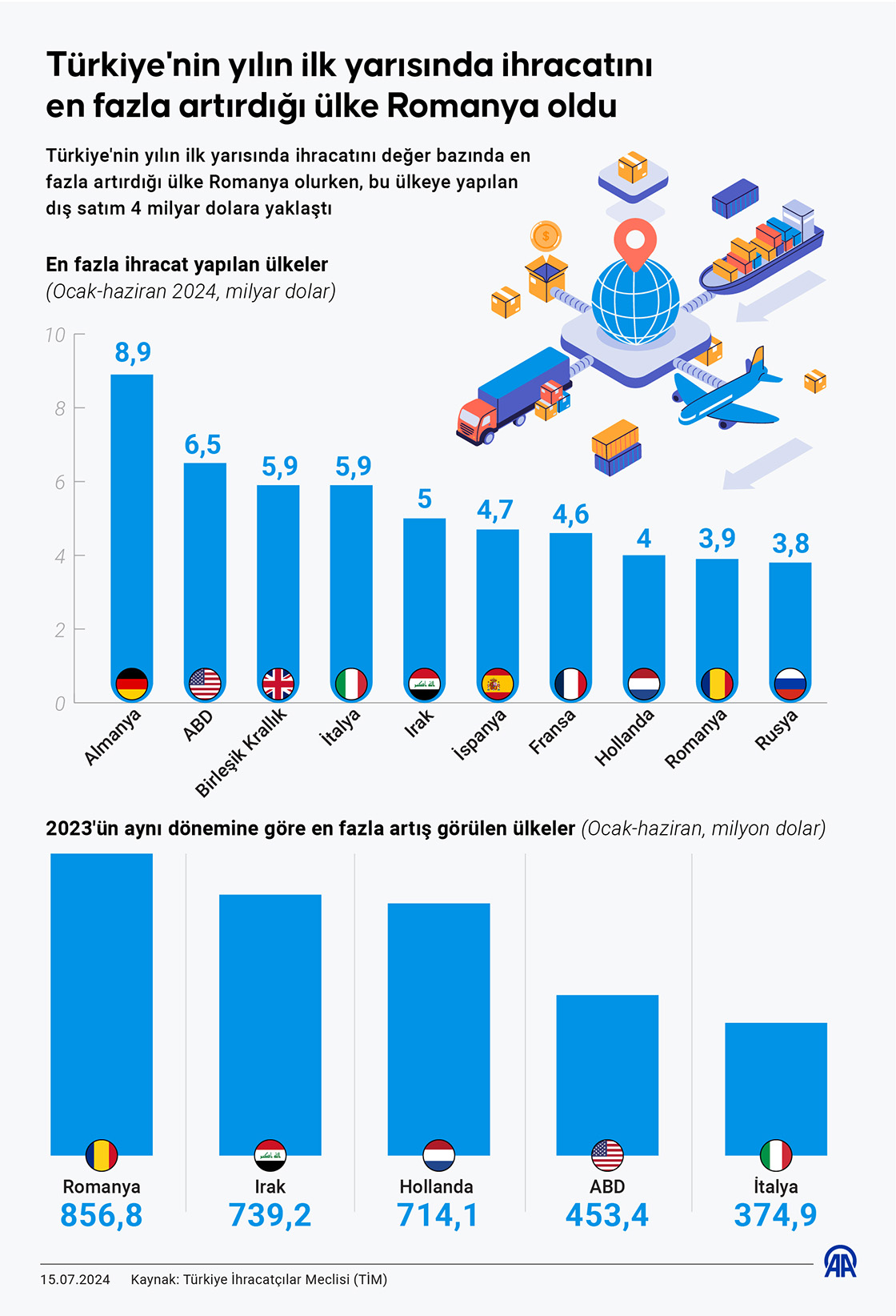 Türkiye'nin yılın ilk yarısında ihracatını değer bazında en fazla artırdığı ülke Romanya olurken, bu ülkeye yapılan dış satım 4 milyar dolara yaklaştı. (Grafik: Yasin Demirci/AA)