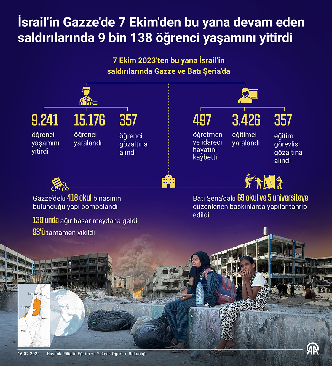 Filistin Eğitim ve Yüksek Öğretim Bakanlığı, İsrail'in Gazze Şeridi'ne saldırılara başladığı 7 Ekim'den bu yana Gazze ve Batı Şeria'da 9 bin 241 öğrencinin yaşamını yitirdiğini bildirdi. (Grafik: Omar Zaghloul/AA)16 Temmuz 2024•Güncelleme: 16 Temmuz 2024