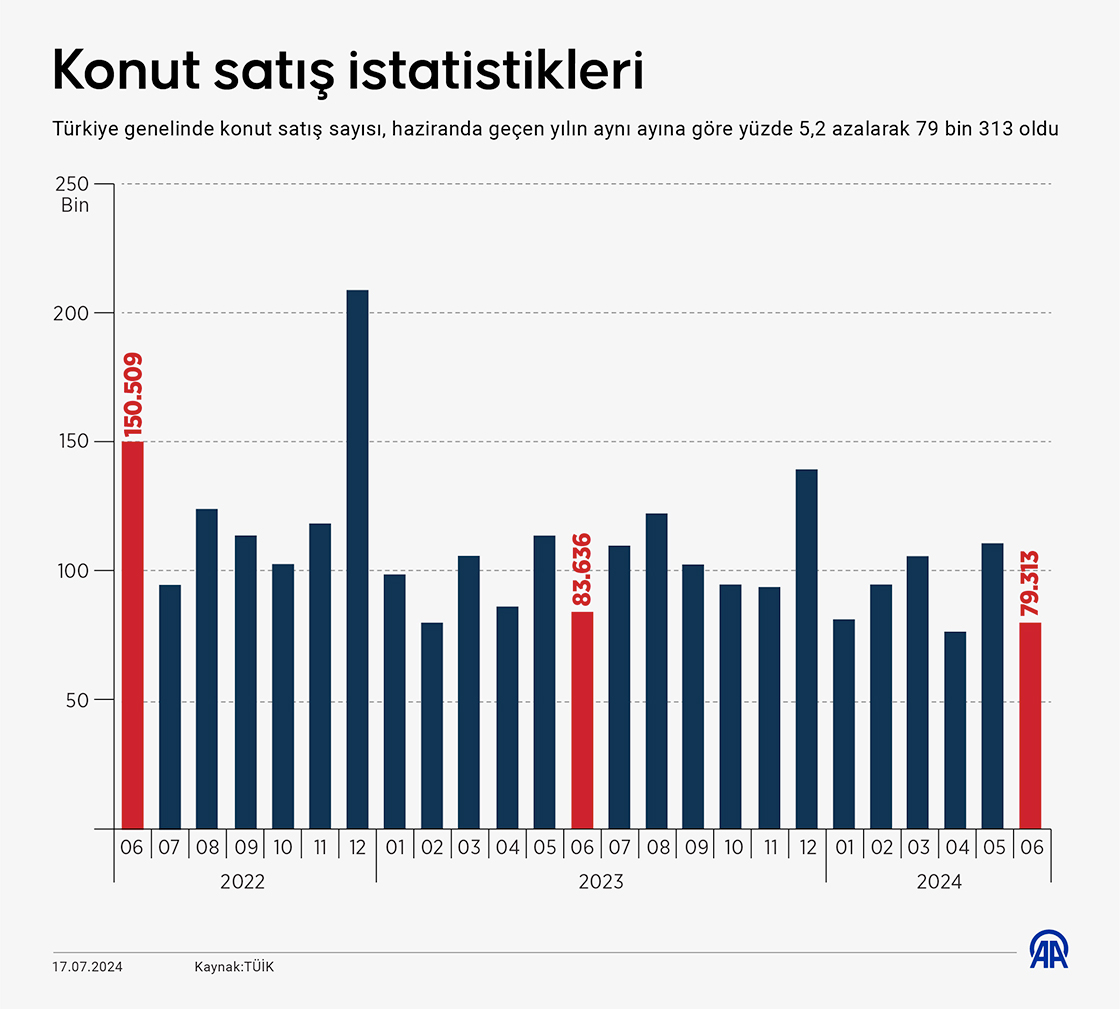 Türkiye genelinde konut satış sayısı, haziranda geçen yılın aynı ayına göre yüzde 5,2 azalarak 79 bin 313 oldu. (Grafik: Mehmet Yaren Bozğun/AA)