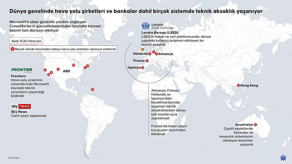 Microsoft'a siber güvenlik yazılımı sağlayan CrowdStrike'ın güncellemelerinden kaynaklı küresel kesinti tüm dünyayı etkiliyor. (Grafik: Yasin Demirci/AA)
