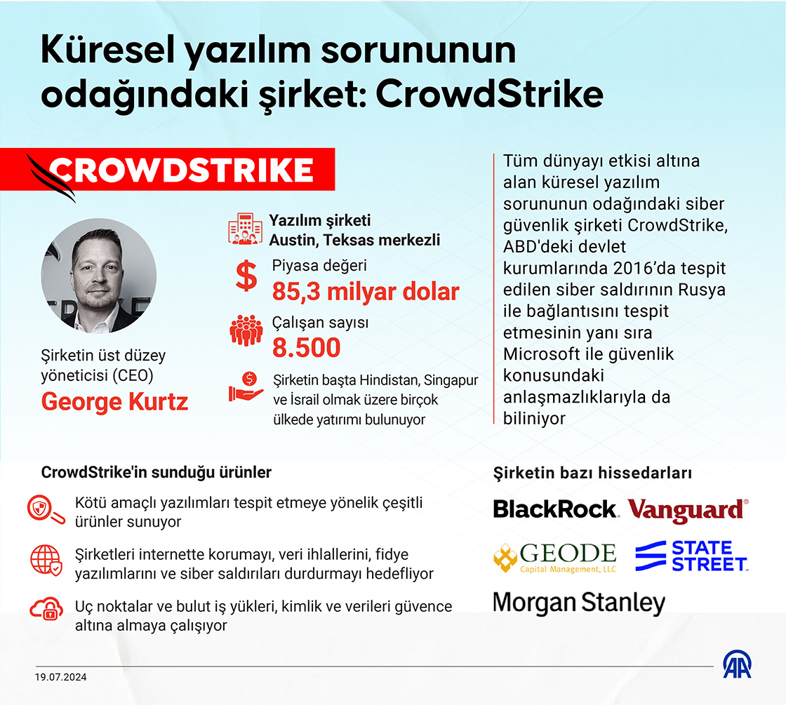 Tüm dünyayı etkisi altına alan küresel yazılım sorununun odağındaki siber güvenlik şirketi CrowdStrike, ABD'deki devlet kurumlarında 2016’da tespit edilen siber saldırının Rusya ile bağlantısını tespit etmesinin yanı sıra Microsoft ile güvenlik konusundaki anlaşmazlıklarıyla da biliniyor. (Grafik: Muhammed Ali Yiğit/AA)19 Temmuz 2024•Güncelleme: 19 Temmuz 2024