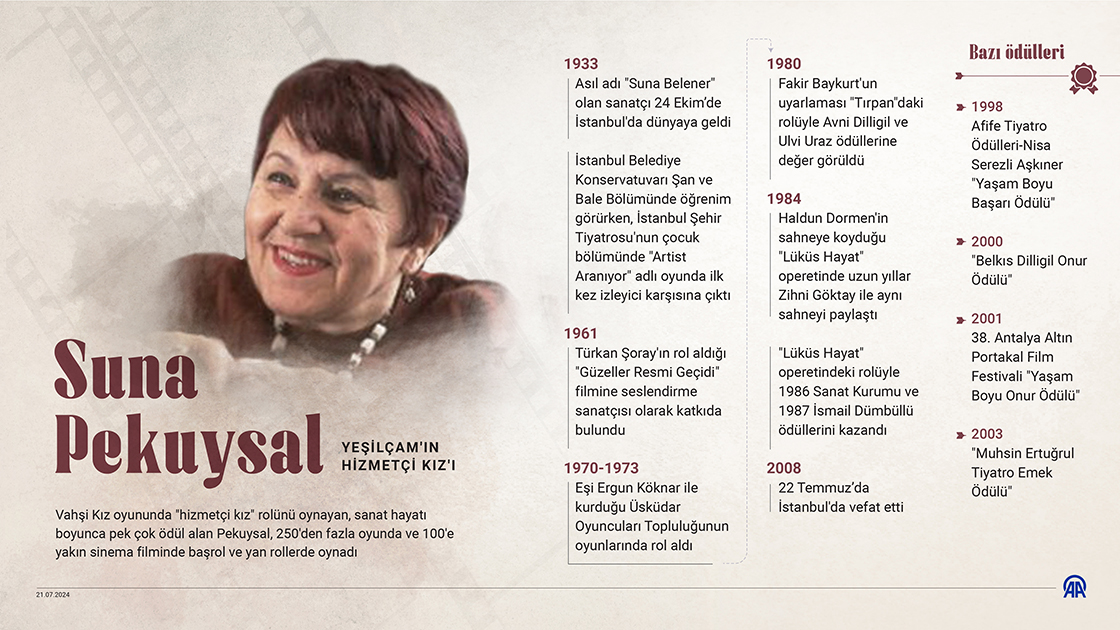 Vahşi Kız oyununda 'hizmetçi kız' rolünü oynayan, sanat hayatı boyunca pek çok ödül alan Pekuysal, 250'den fazla oyunda ve 100'e yakın sinema filminde başrol ve yan rollerde oynadı. (Grafik: Efnan İpşir/AA)