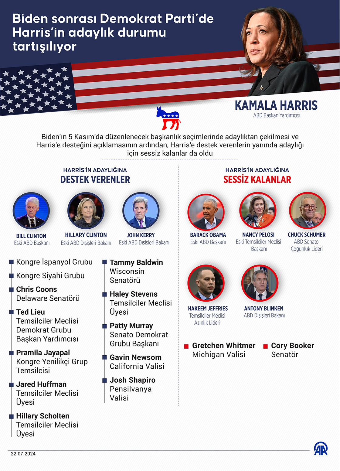 Biden'ın 5 Kasım'da düzenlenecek başkanlık seçimlerinde adaylıktan çekilmesi ve Harris'e desteğini açıklamasının ardından, Harris'e destek verenlerin yanında adaylığı için sessiz kalanlar da oldu. (Grafik: Mevlüt Eren/AA)22 Temmuz 2024•Güncelleme: 22 Temmuz 2024