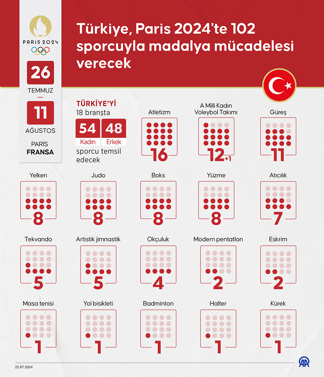 2024 Paris Olimpiyat Oyunları'nda Türkiye, 18 branşta toplam 102 sporcuyla temsil edilecek. (Grafik: Muhammed Ali Yiğit/AA)