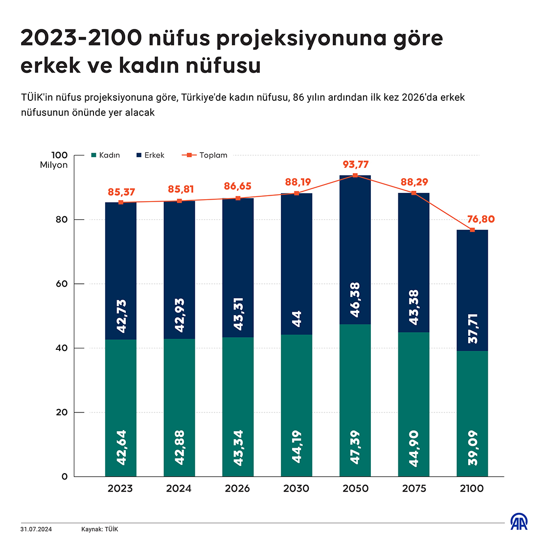TÜİK'in nüfus projeksiyonuna göre, Türkiye'de kadın nüfusu, 86 yılın ardından ilk kez 2026'da erkek nüfusunun önünde yer alacak. (Grafik: Mehmet Yaren Bozğun/AA)