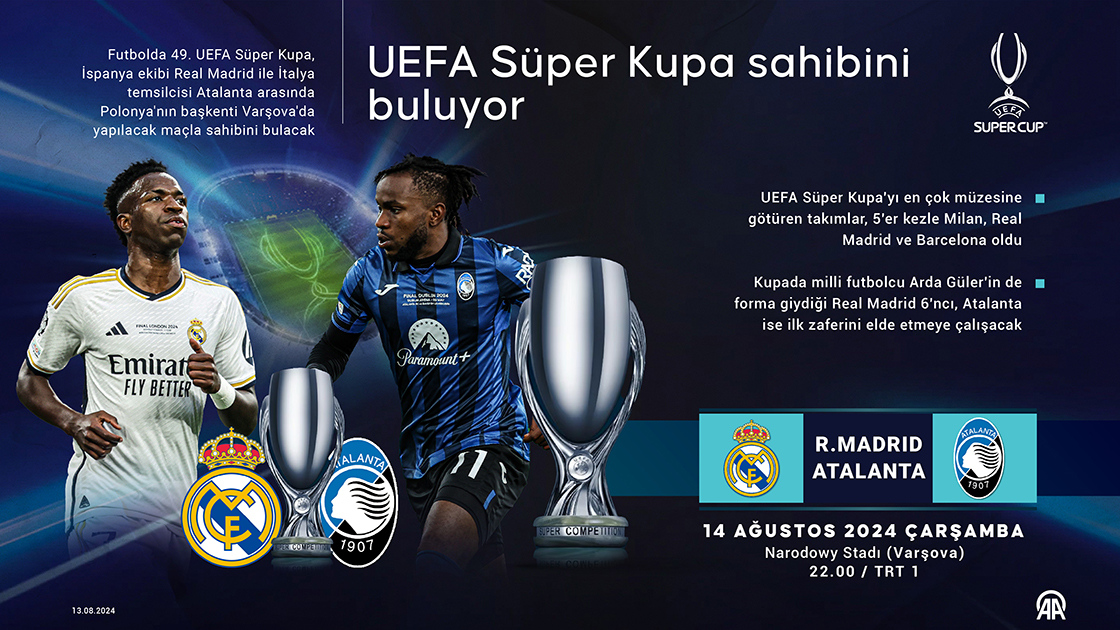 Futbolda 49. UEFA Süper Kupa, İspanya ekibi Real Madrid ile İtalya temsilcisi Atalanta arasında yapılacak maçla sahibini bulacak. (Grafik: Kemal Delikmen/AA)