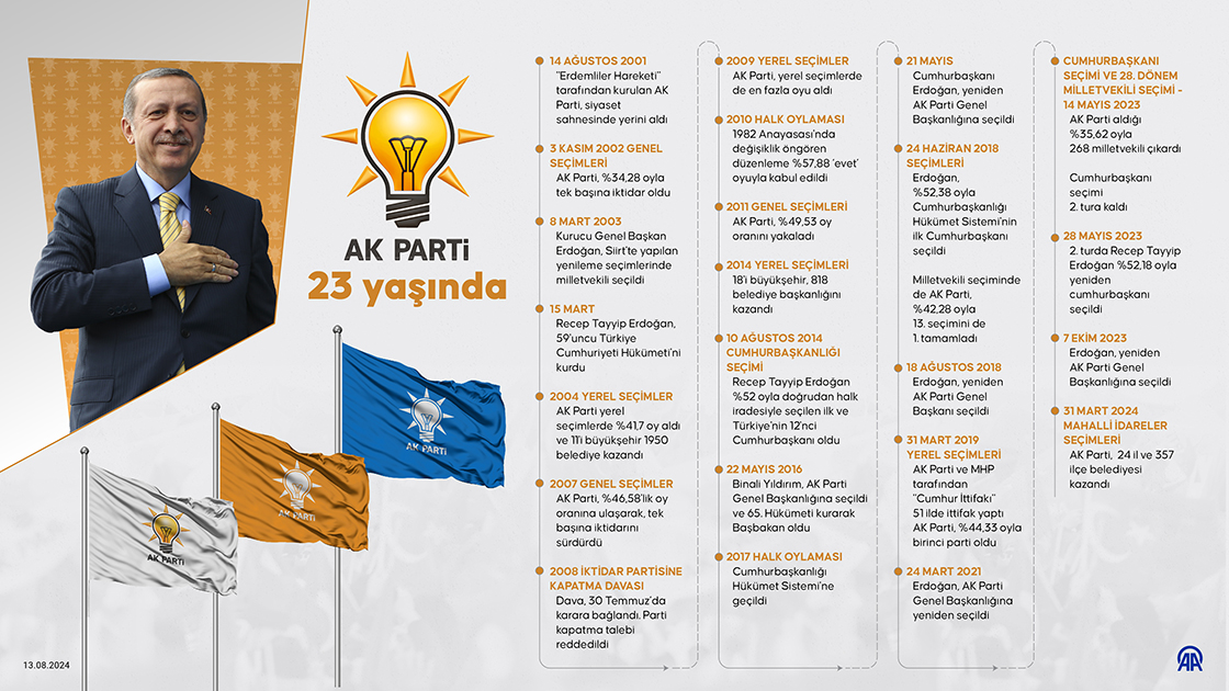 Recep Tayyip Erdoğan'ın liderliğinde, 14 Ağustos 2001'de Türkiye'nin 39. partisi olarak Türk siyasi hayatına giren AK Parti, siyaset sahnesinde 23 yılı geride bıraktı. (Grafik: Ufuk Celal Güzel/AA)