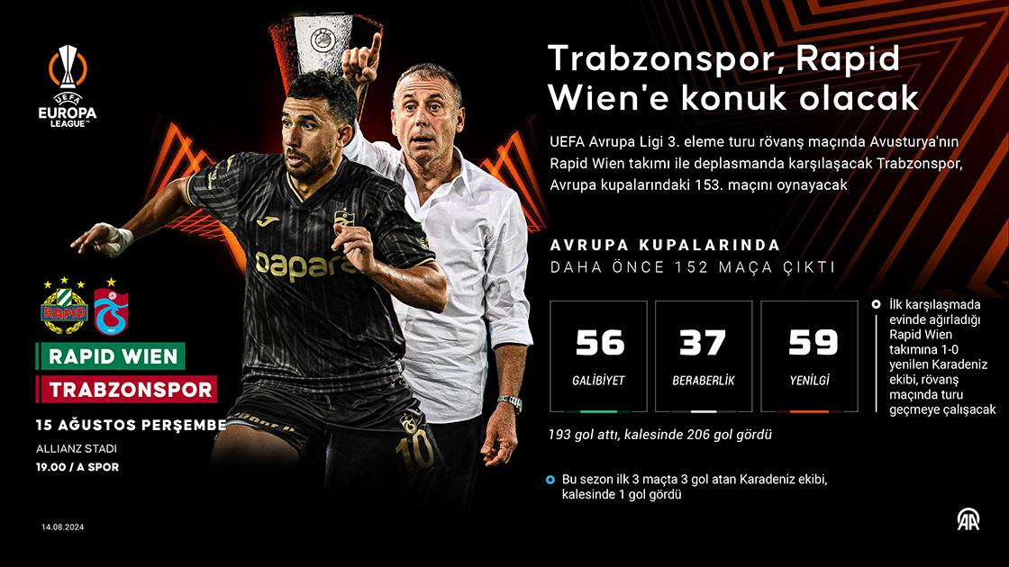 UEFA Avrupa Ligi 3. eleme turu rövanş maçında Avusturya'nın Rapid Wien takımı ile deplasmanda karşılaşacak Trabzonspor, Avrupa kupalarındaki 153. maçını oynayacak. ( Kemal Delikmen - Anadolu Ajansı )
