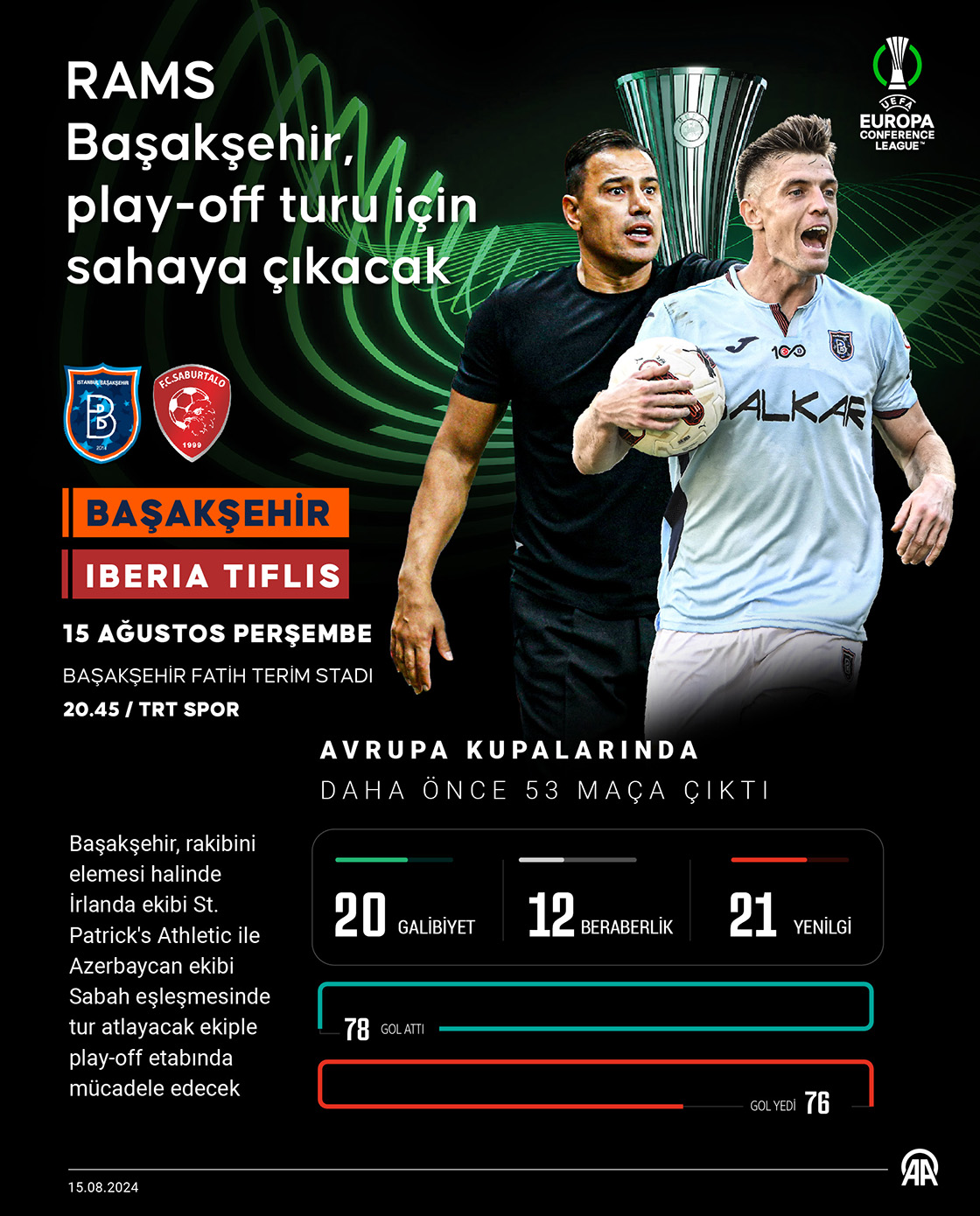RAMS Başakşehir, UEFA Konferans Ligi 3. eleme turu rövanş maçında yarın Gürcistan'ın Iberia Tiflis takımıyla sahasında karşı karşıya gelecek. (Grafik: Kemal Delikmen/AA)