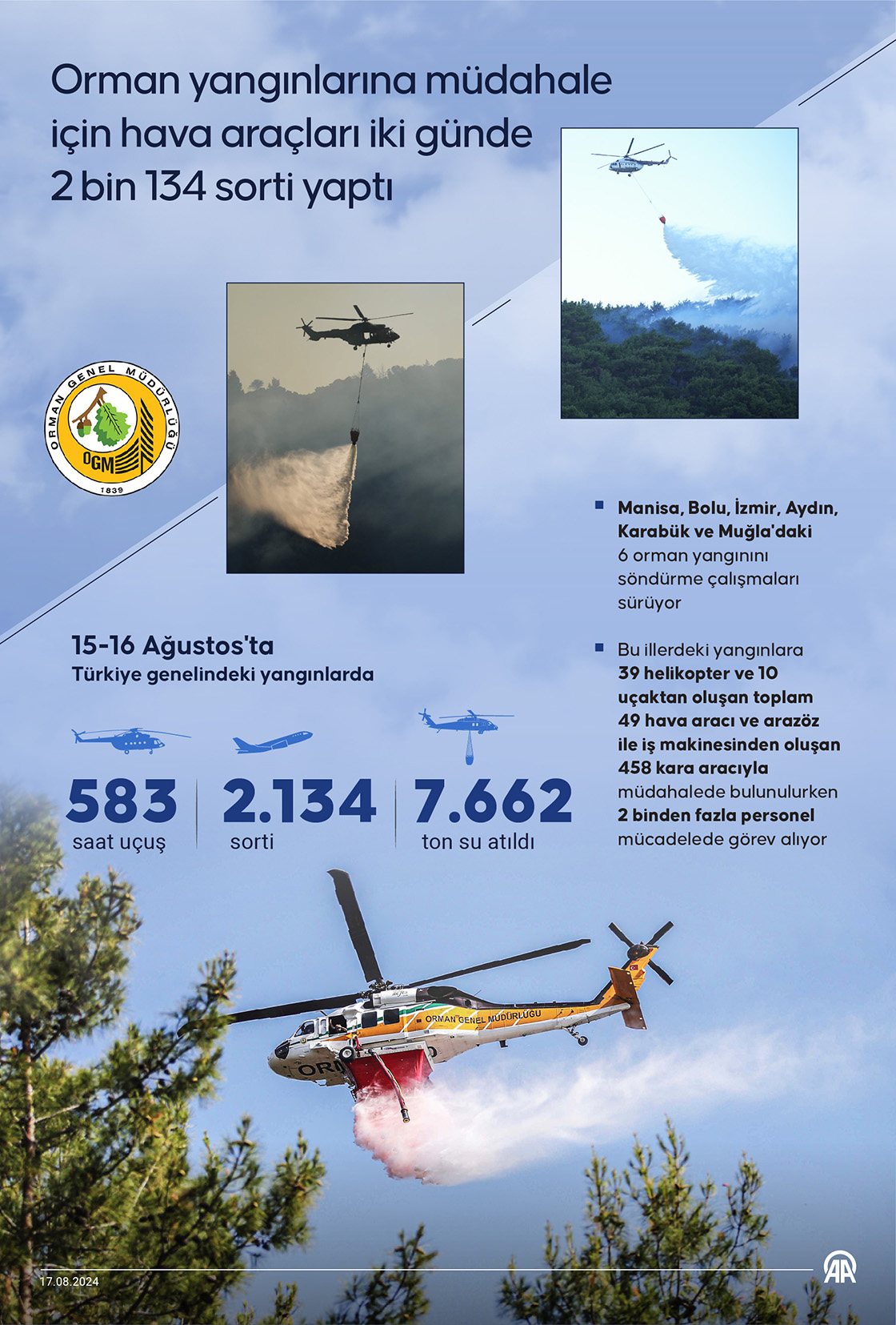 Tarım ve Orman Bakanlığı Orman Genel Müdürlüğü (OGM) hava araçları, ülke genelinde 15-16 Ağustos'ta çıkan orman yangınları nedeniyle 2 bin 134 sorti yaparak alevlere 7 bin 662 ton su attı. (Grafik: Kemal Delikmen/AA)17 Ağustos 2024•Güncelleme: 17 Ağustos 2024