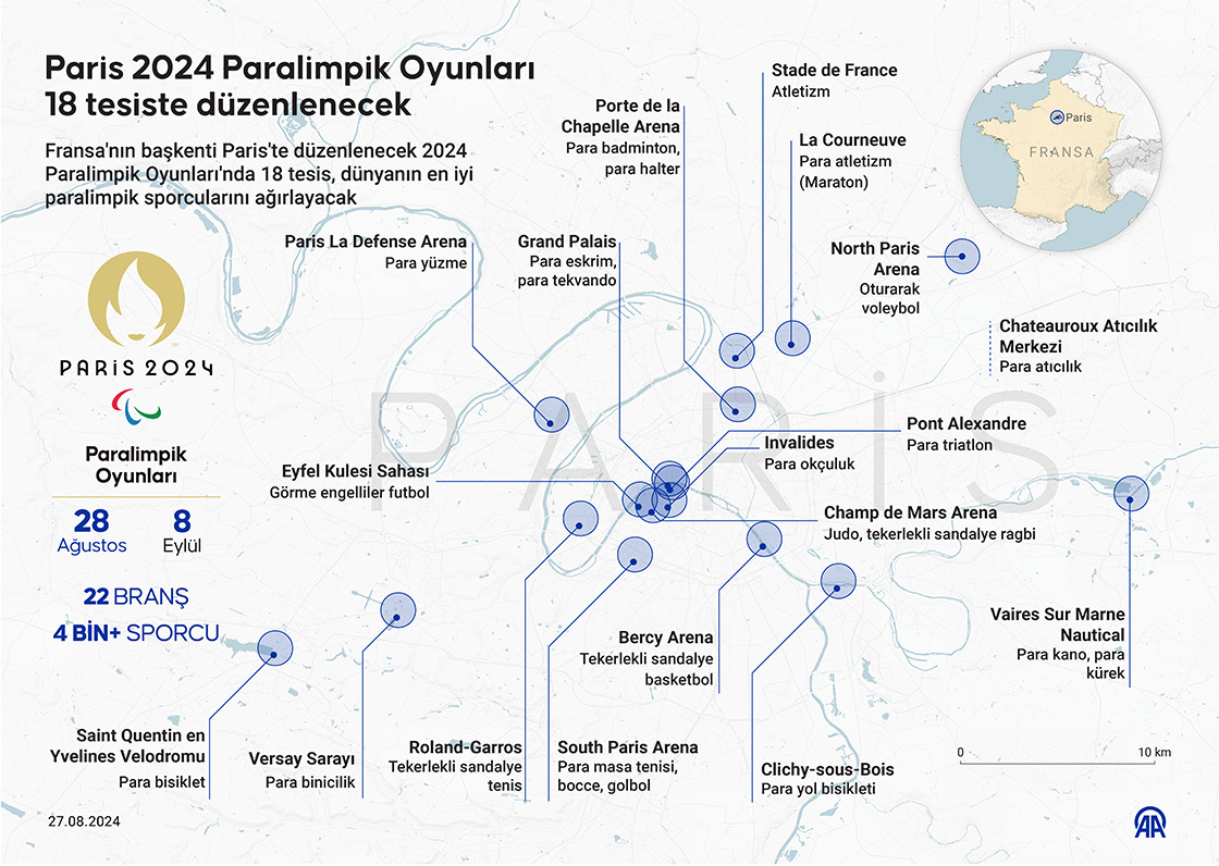 Fransa'nın başkenti Paris'te düzenlenecek 2024 Paralimpik Oyunları'nda 18 tesis, dünyanın en iyi paralimpik sporcularını ağırlayacak. (Grafik: Murat Usubali/AA)