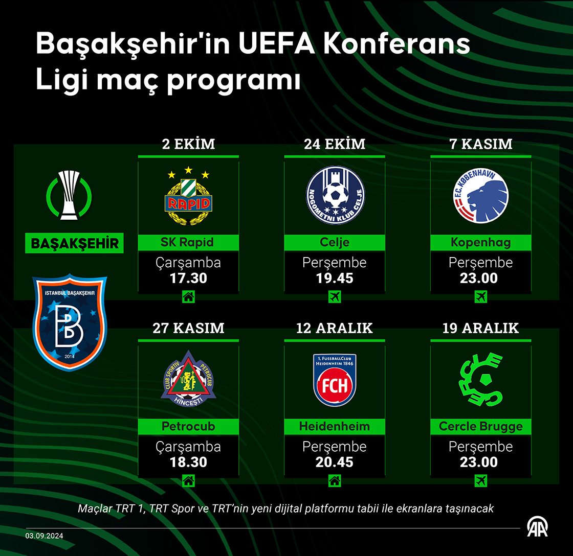 Turuncu-lacivertli ekip, UEFA Konferans Ligi'nde Kopenhag (Danimarka) (D), Heidenheim (Almanya), Rapid Wien (Avusturya), Cercle Brugge (Belçika) (D), Petrocub (Moldova) ve Celje (Slovenya) (D) ile karşılaşacak. (Grafik: Muhammed Ali Yiğit/AA)
