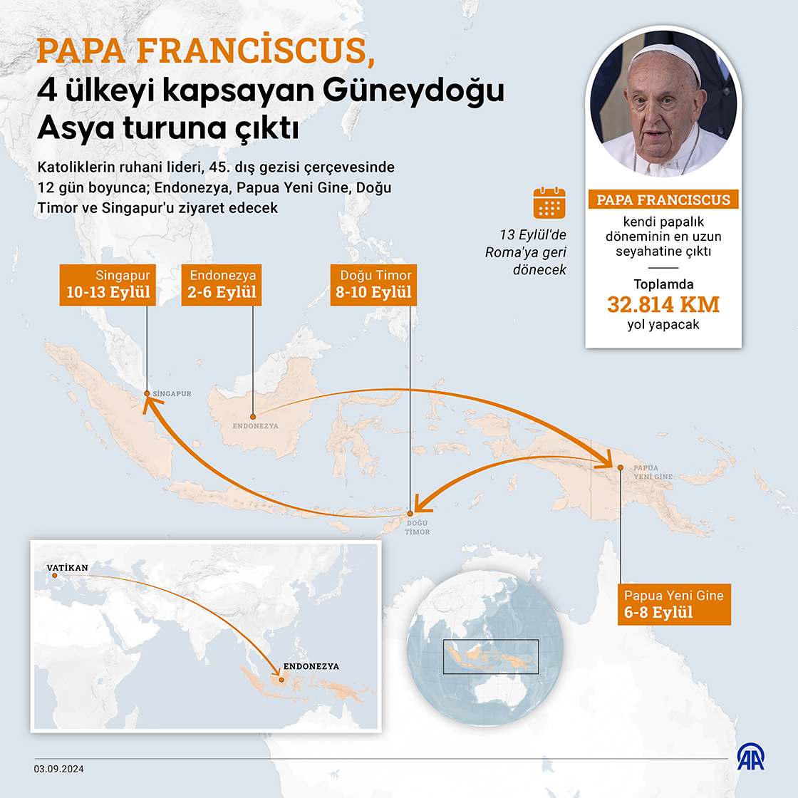 Katoliklerin ruhani lideri, 45. dış gezisi çerçevesinde 12 gün boyunca; Endonezya, Papua Yeni Gine, Doğu Timor ve Singapur'u ziyaret edecek. (Grafik: Muhammed Ali Yiğit/AA)