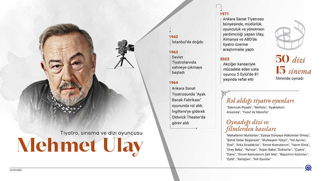 Tiyatro, sinema ve dizi oyuncusu Mehmet Ulay'ın vefatının üzerinden bir yıl geçti. (Grafik: Nuray Yüksel/AA)
