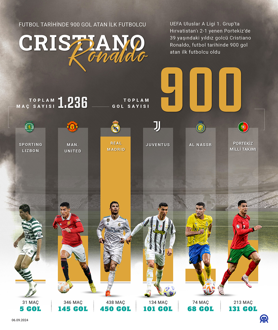 UEFA Uluslar A Ligi 1 Grup'ta Hırvatistan'ı 2-1 yenen Portekiz'de 39 yaşındaki yıldız golcü Cristiano Ronaldo, futbol tarihinde 900 gol atan ilk futbolcu oldu. (Grafik: Kemal Delikmen/AA)