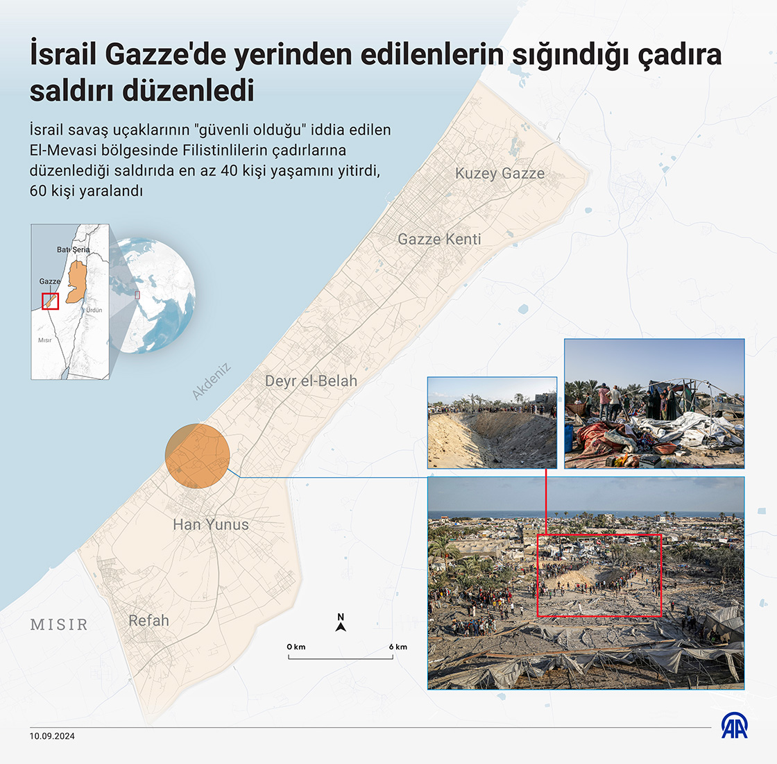 İsrail ordusunun El-Mevasi bölgesinde yerinden edilen Filistinlilerin çadırlarına düzenlediği saldırıda en az 40 kişi yaşamını yitirdi, 60 kişi yaralandı. (Grafik: Omar Zaghloul/AA)