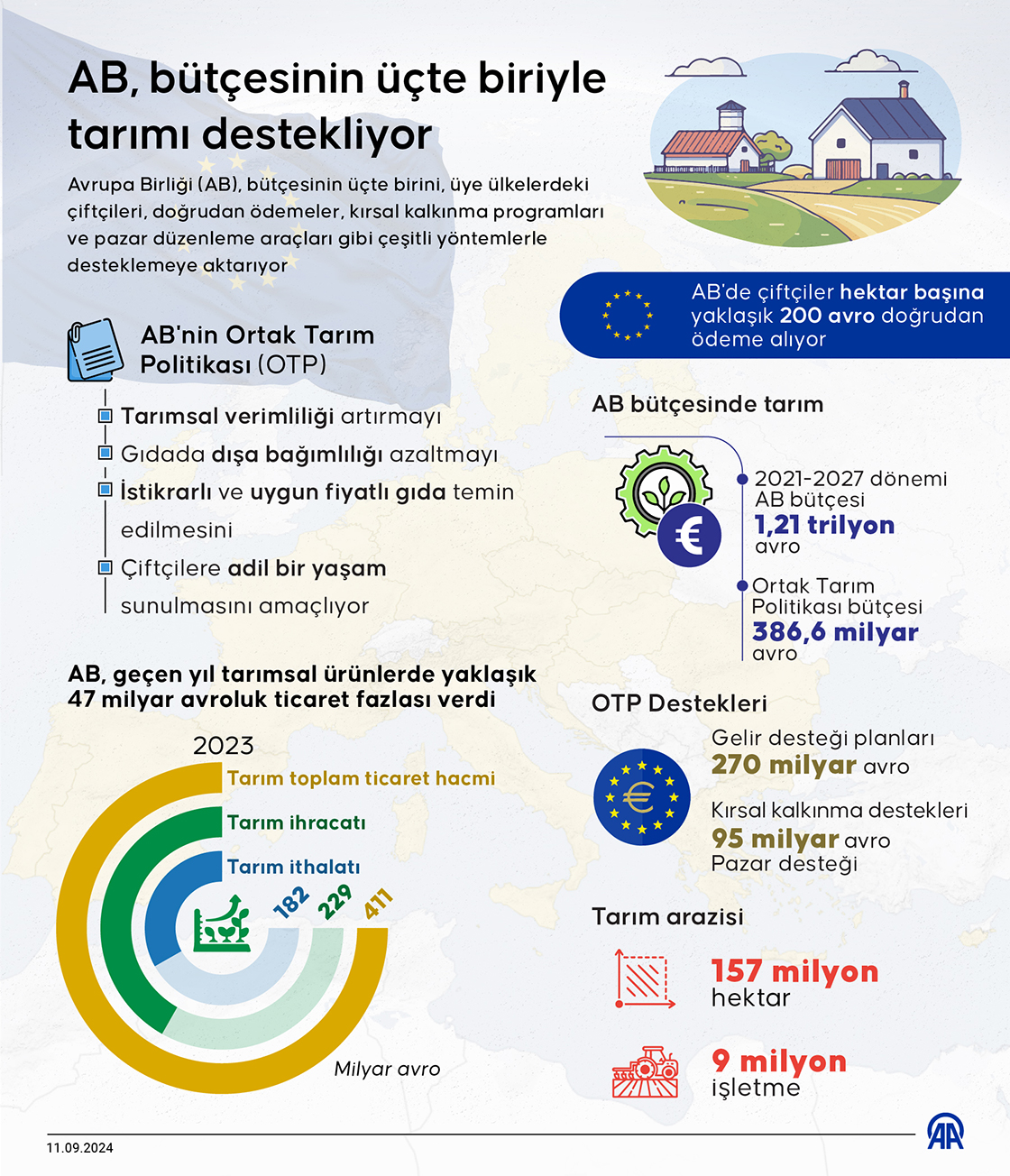 Avrupa Birliği (AB), bütçesinin üçte birini, üye ülkelerdeki çiftçileri, doğrudan ödemeler, kırsal kalkınma programları ve pazar düzenleme araçları gibi çeşitli yöntemlerle desteklemeye aktarıyor. (Grafik: Ufuk Celal Güzel/AA)