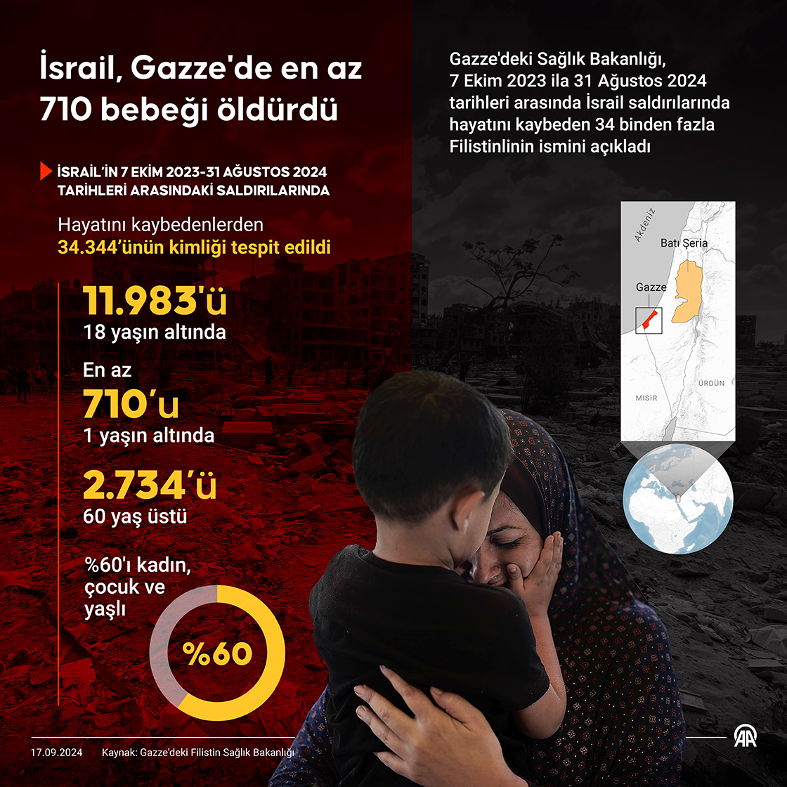 Gazze'deki Sağlık Bakanlığı, 7 Ekim 2023 ila 31 Ağustos 2024 tarihleri arasında İsrail saldırılarında hayatını kaybeden 34 binden fazla Filistinlinin ismini açıkladı. Grafik: Murat Usubali/AA)