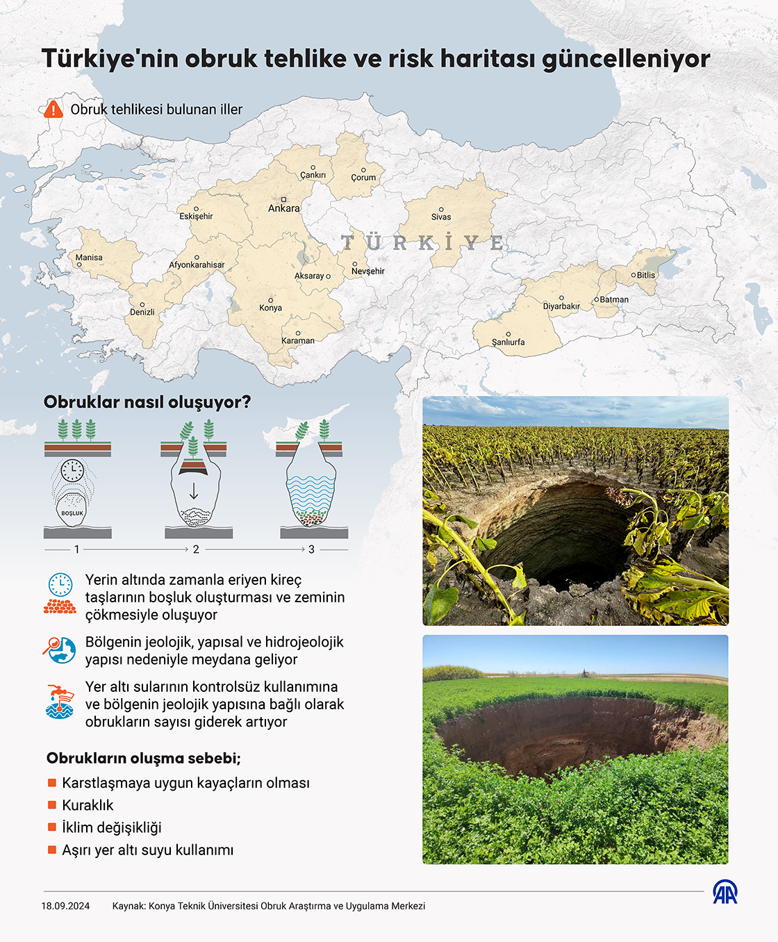 Konya Teknik Üniversitesi Obruk Araştırma ve Uygulama Merkezi Müdürü Prof. Dr. Fetullah Arık, obruk tehlikesi bulunan il sayısını geçen yıl AFAD'la birlikte 16 olarak belirlediklerini ifade ederek, 'Bu illerin büyük çoğunluğunda da bu yıl obruklar görüldü.' dedi. Grafik: Murat Usubali/AA) 18 Eylül 2024•Güncelleme: 18 Eylül 2024