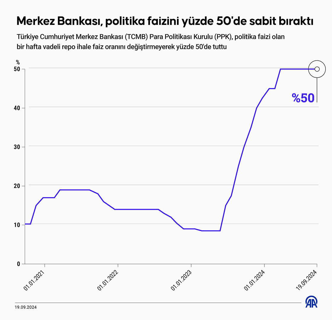 Türkiye Cumhuriyet Merkez Bankası (TCMB) Para Politikası Kurulu (PPK), politika faizi olan bir hafta vadeli repo ihale faiz oranını değiştirmeyerek yüzde 50'de tuttu. (Grafik: Muhammed Ali Yiğit/AA)