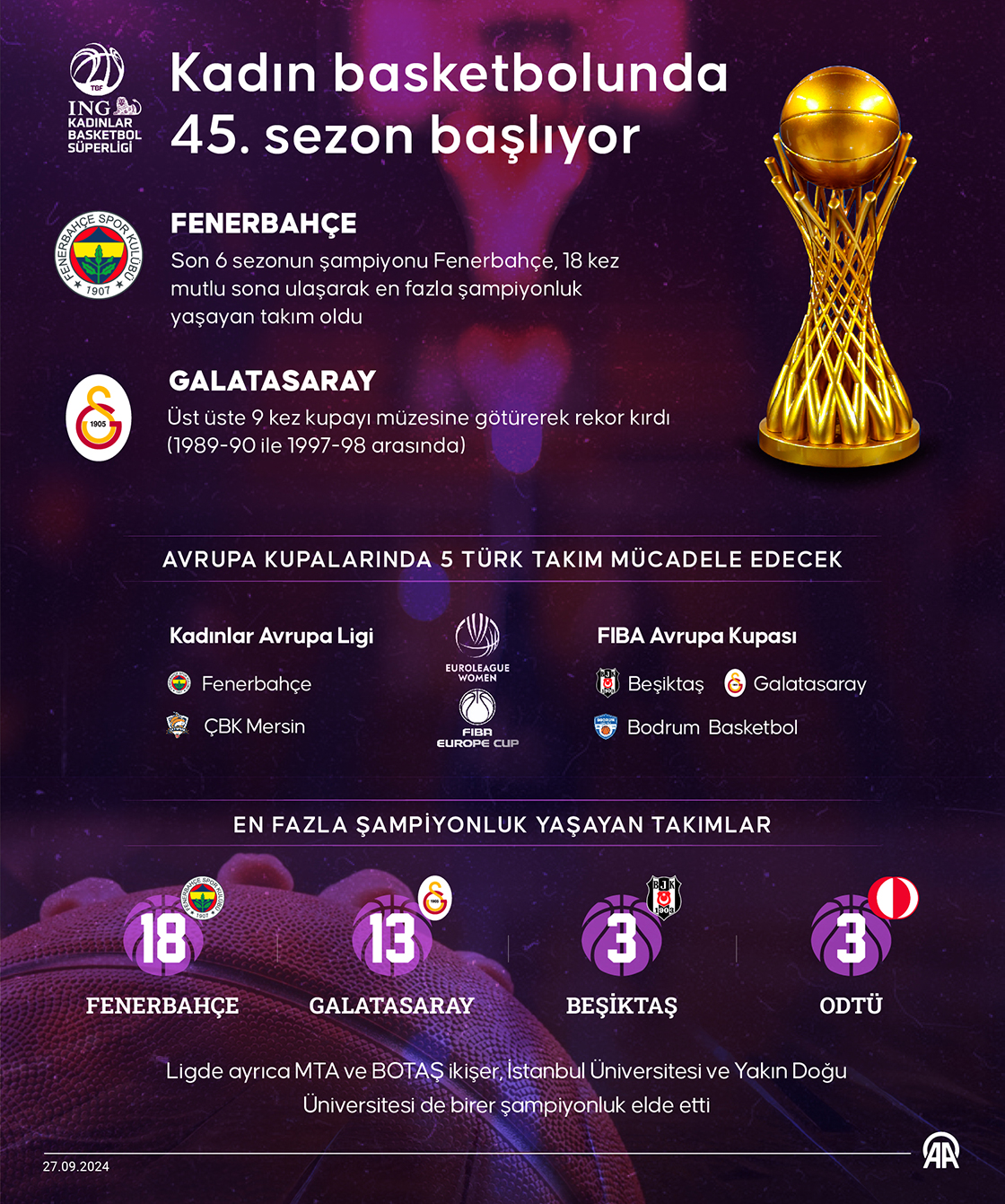 ING Kadınlar Basketbol Süper Ligi'nde 45. sezon, yapılacak maçlarla başlayacak. (Grafik: Ufuk Celal Güzel/AA)