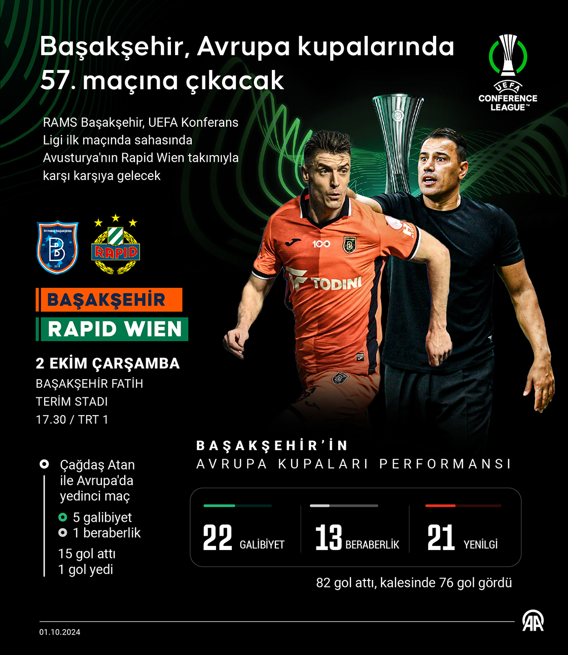 UEFA Konferans Ligi ilk hafta maçında yarın Avusturya'nın Rapid Wien ekibini konuk edecek RAMS Başakşehir, Avrupa kupalarında 57. karşılaşmasını oynayacak. (Grafik: Kemal Delikmen/AA)