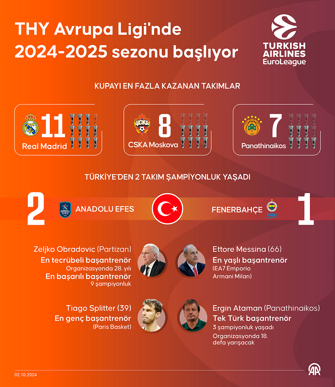 Basketbol THY Avrupa Ligi'nin yarın başlayacak 2024-2025 sezonu öncesinde, İspanya temsilcisi Real Madrid en fazla kupa sevinci yaşayan takım olarak dikkati çekiyor. (Grafik: Mehmet Yaren Bozğun/AA)