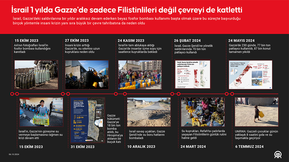 İsrail, Gazze'deki saldırılarına bir yıldır aralıksız devam ederken beyaz fosfor bombası kullanımı başta olmak üzere bu süreçte başvurduğu birçok yöntemle insani krizin yanı sıra büyük bir çevre tahribatına da neden oldu. (Grafik: Elif Acar/AA)06 Ekim 2024•Güncelleme: 06 Ekim 2024