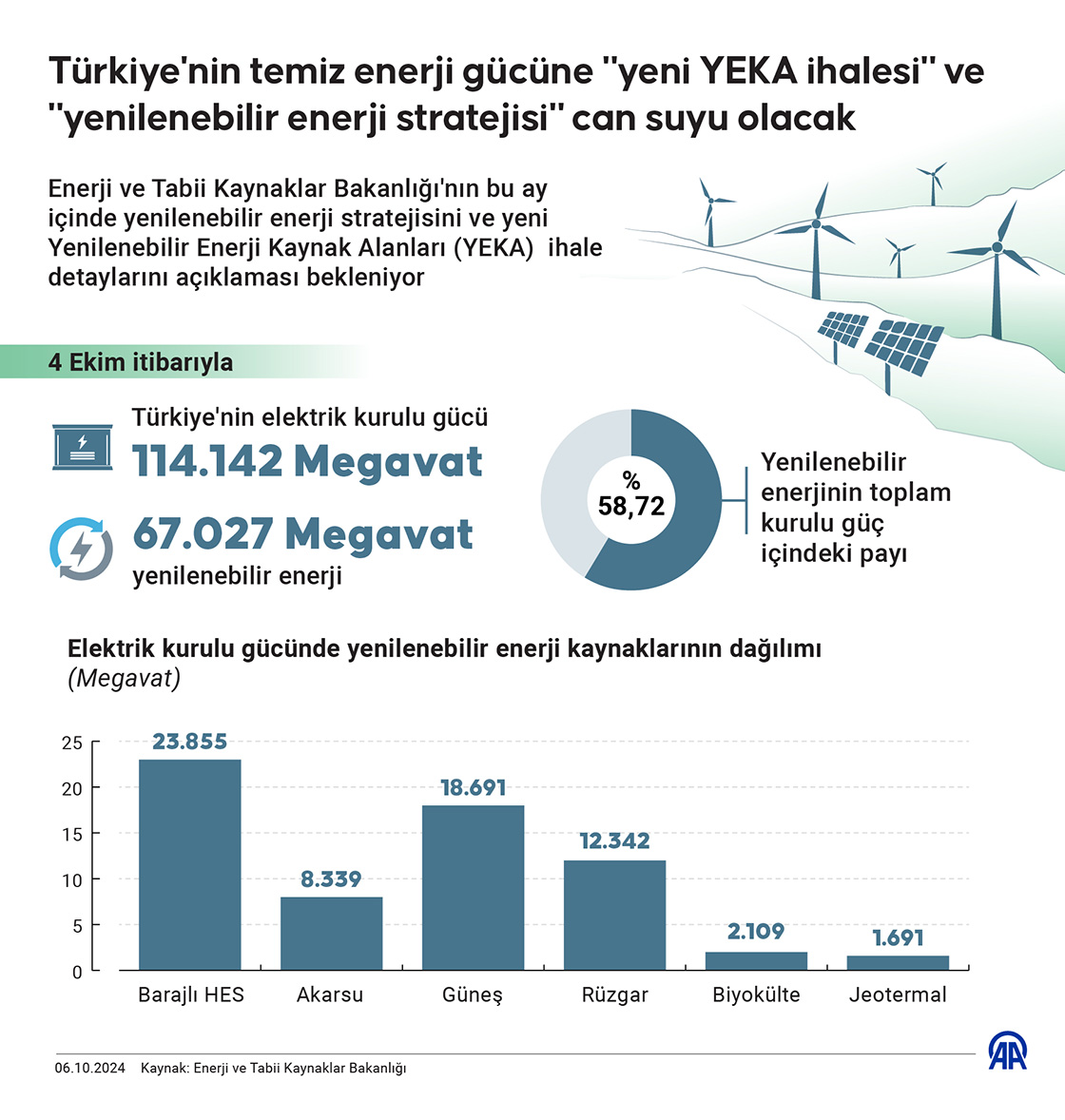 Enerji ve Tabii Kaynaklar Bakanlığı'nın bu ay içinde yenilenebilir enerji stratejisini ve yeni Yenilenebilir Enerji Kaynak Alanları (YEKA) ihale detaylarını açıklaması bekleniyor. (Grafik: Efnan İpşir/AA)06 Ekim 2024•Güncelleme: 06 Ekim 2024