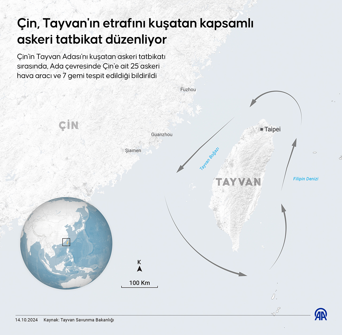 Çin'in Tayvan Adası'nı kuşatan askeri tatbikatı sırasında, Ada çevresinde Çin'e ait 25 askeri hava aracı ve 7 gemi tespit edildiği bildirildi. (Grafik: Muhammed Ali Yiğit/AA)