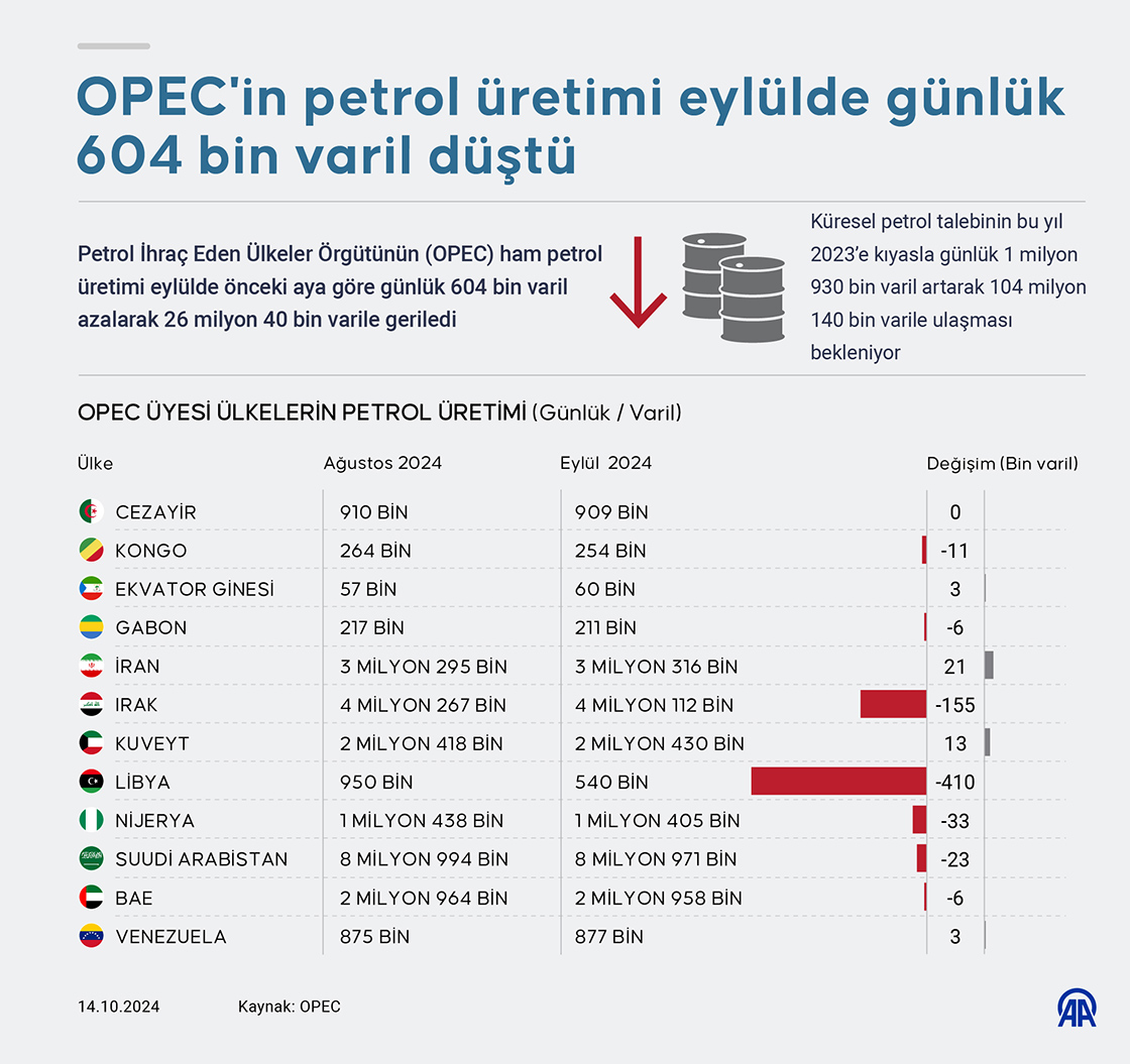 Petrol İhraç Eden Ülkeler Örgütünün (OPEC) ham petrol üretimi eylülde önceki aya göre günlük 604 bin varil azalarak 26 milyon 40 bin varile geriledi. (Grafik: Efnan İpşir/AA)