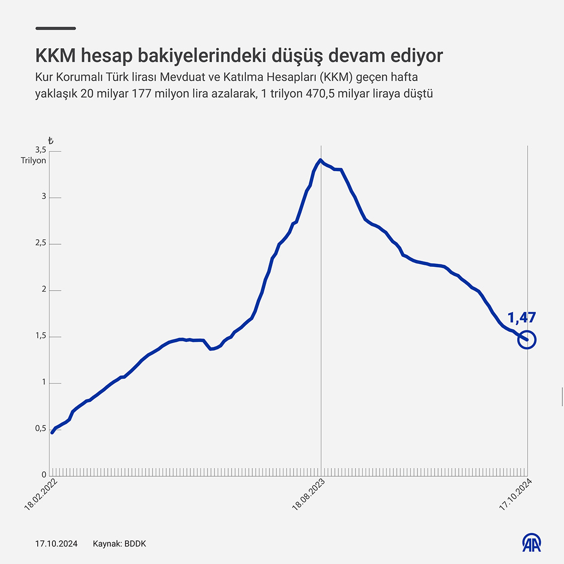 Kur Korumalı Türk lirası Mevduat ve Katılma Hesapları (KKM) geçen hafta yaklaşık 20 milyar 177 milyon lira azalarak, 1 trilyon 470,5 milyar liraya düştü. (Grafik: Yılmaz Yücel/AA)