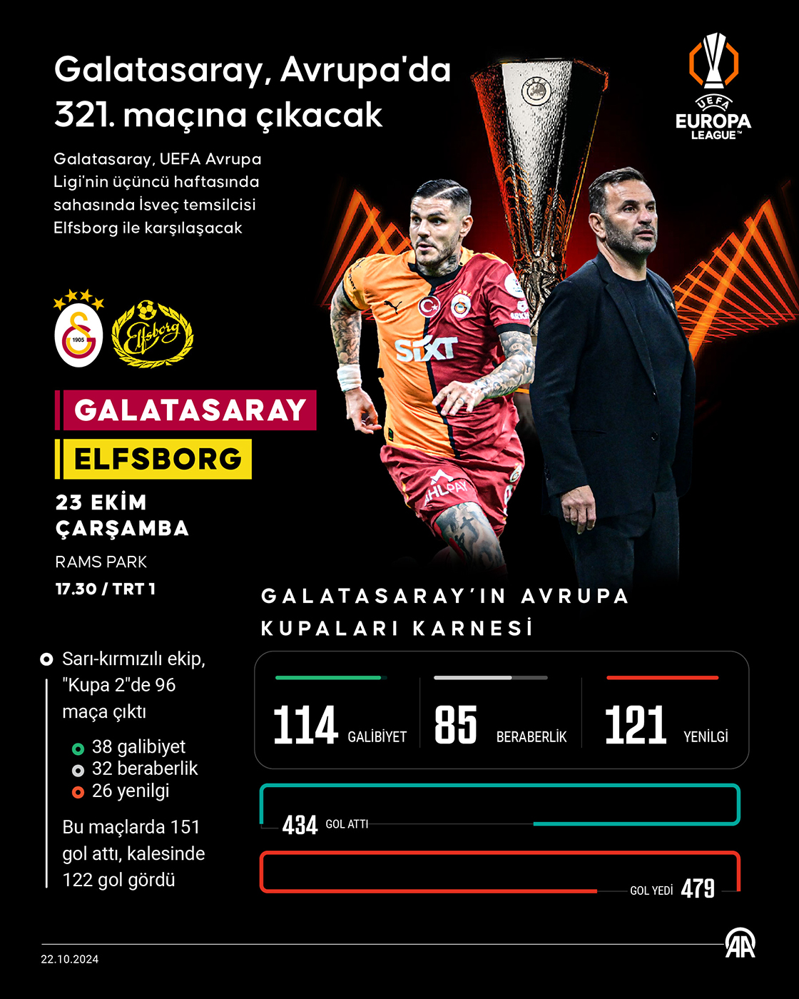 UEFA Avrupa Ligi'nin üçüncü haftasında sahasında İsveç temsilcisi Elfsborg ile karşılaşacak Galatasaray, Avrupa kupalarındaki 321. mücadelesine çıkacak. (Grafik: Kemal Delikmen/AA)
