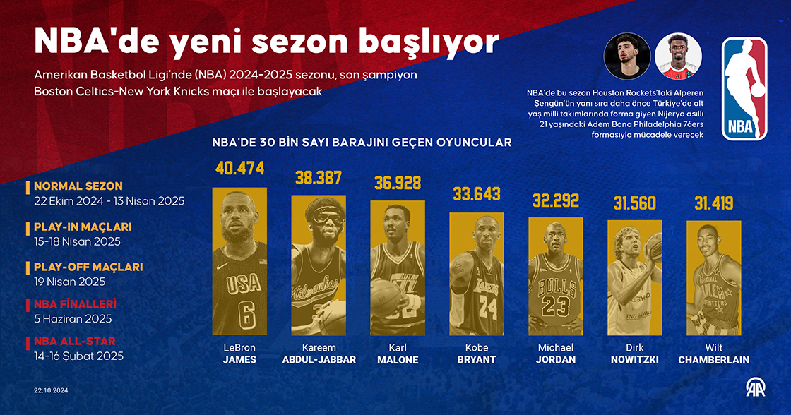 Amerikan Basketbol Ligi'nde (NBA) 2024-2025 sezonu, son şampiyon Boston Celtics-New York Knicks maçı ile başlayacak. (Grafik: Ufuk Celal Güzel/AA)