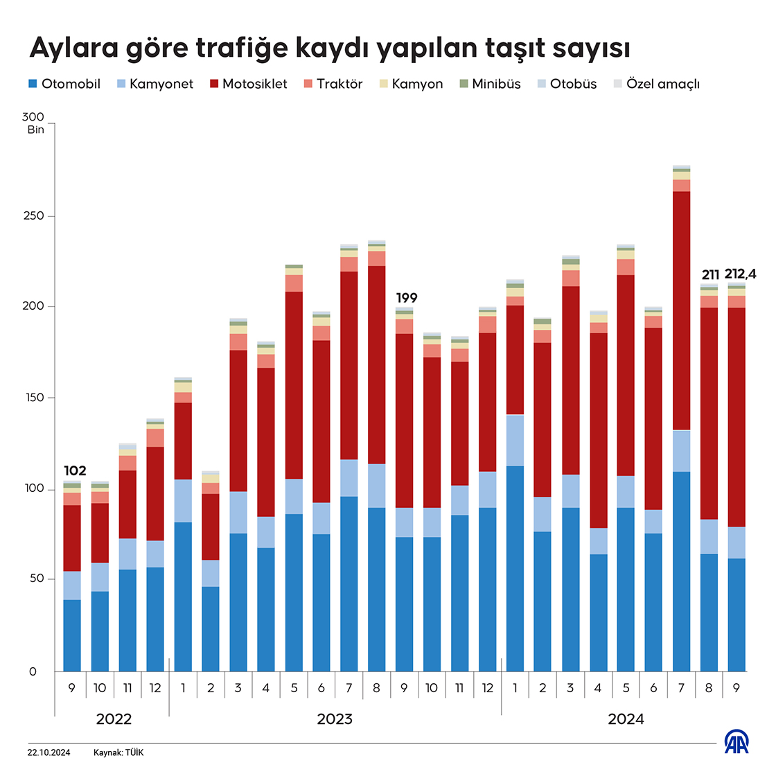 Eylülde trafiğe kaydı yapılan taşıt sayısı geçen yılın aynı ayına kıyasla yüzde 6,9 artarak 212 bin 451'e yükseldi. (Grafik: Mehmet Yaren Bozğun/AA