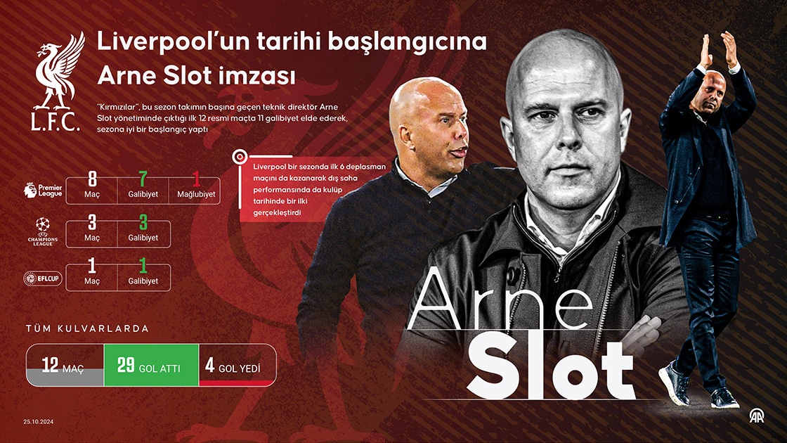 “Kırmızılar”, bu sezon takımın başına geçen teknik direktör Arne Slot yönetiminde çıktığı ilk 12 resmi maçta 11 galibiyet elde ederek, sezona iyi bir başlangıç yaptı. (Grafik: Ufuk Celal Güzel/AA)
