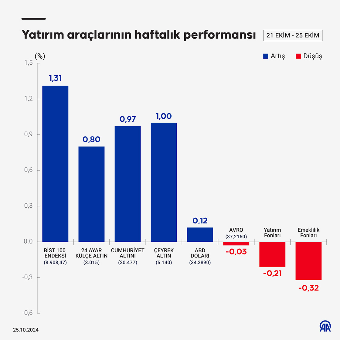 Borsa İstanbul'da işlem gören hisse senetleri haftalık bazda ortalama yüzde 1,31, dolar/TL yüzde 0,12, altının gram fiyatı yüzde 0,80 değer kazanırken, avro/TL yüzde 0,03 azalış gösterdi.