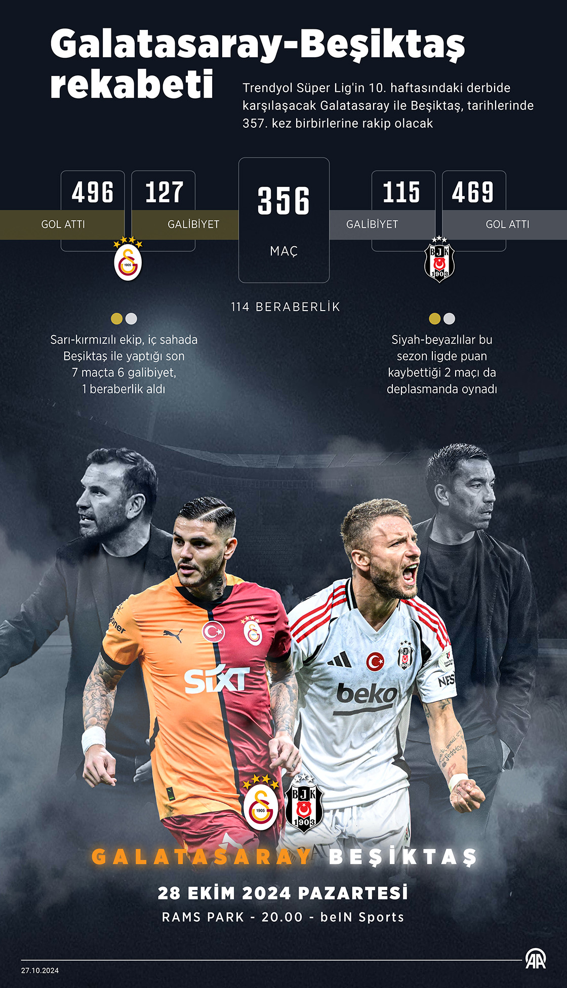 Trendyol Süper Lig'in 10. haftasındaki derbide karşılaşacak Galatasaray ile Beşiktaş, tarihlerinde 357. kez birbirlerine rakip olacak. (Grafik: Kemal Delikmen/AA)