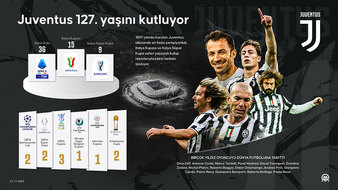 1897 yılında kurulan Juventus, ülkesinde en fazla şampiyonluk, İtalya Kupası ve İtalya Süper Kupa zaferi yaşayan kulüp rekorlarıyla köklü tarihini süslüyor. (Grafik: Ufuk Celal Güzel/AA)