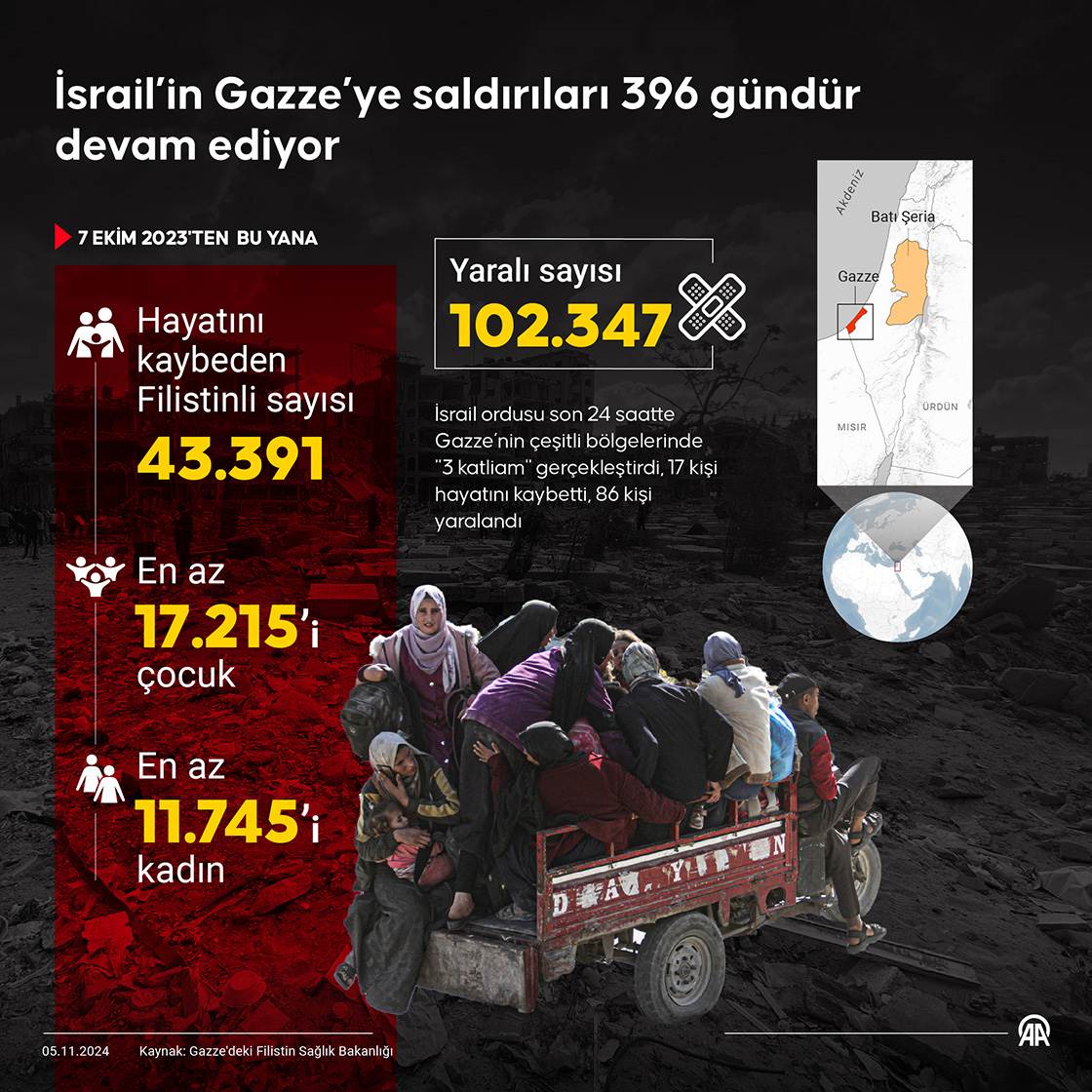İsrail ordusunun Gazze Şeridi'ne 7 Ekim 2023'ten bu yana düzenlediği saldırılarda hayatını kaybedenlerin sayısı son 24 saatte 17 artarak 43 bin 391'e çıktı. (Grafik: Efnan İpşir/AA)