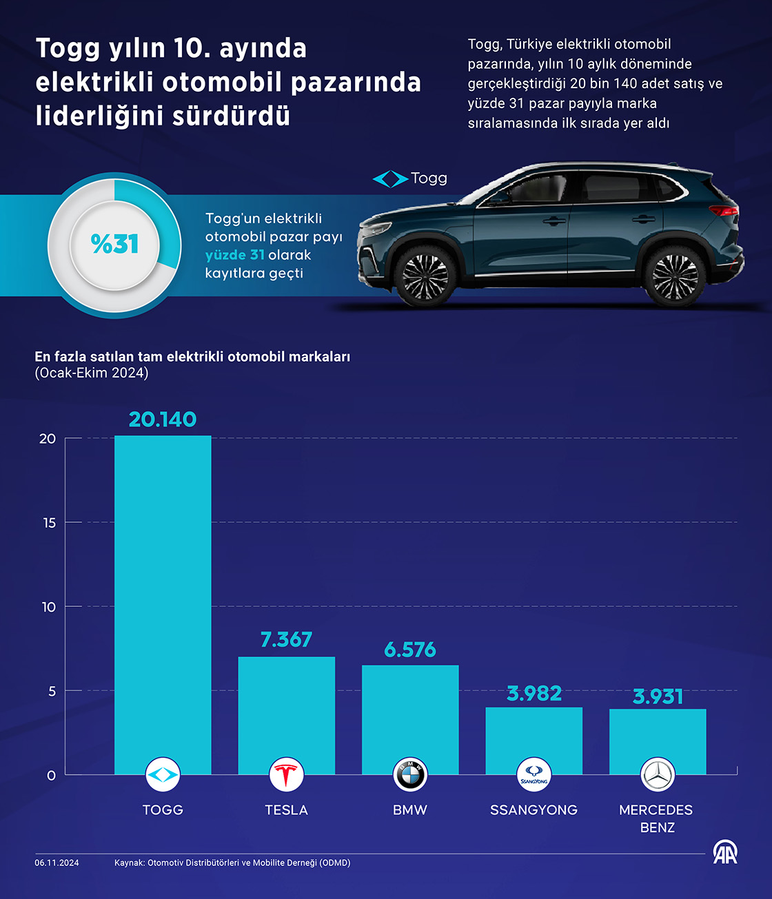 Togg, Türkiye elektrikli otomobil pazarında, yılın 10 aylık döneminde gerçekleştirdiği 20 bin 140 adet satış ve yüzde 31 pazar payıyla marka sıralamasında ilk sırada yer aldı. (Grafik: Mehmet Yaren Bozğun/AA)