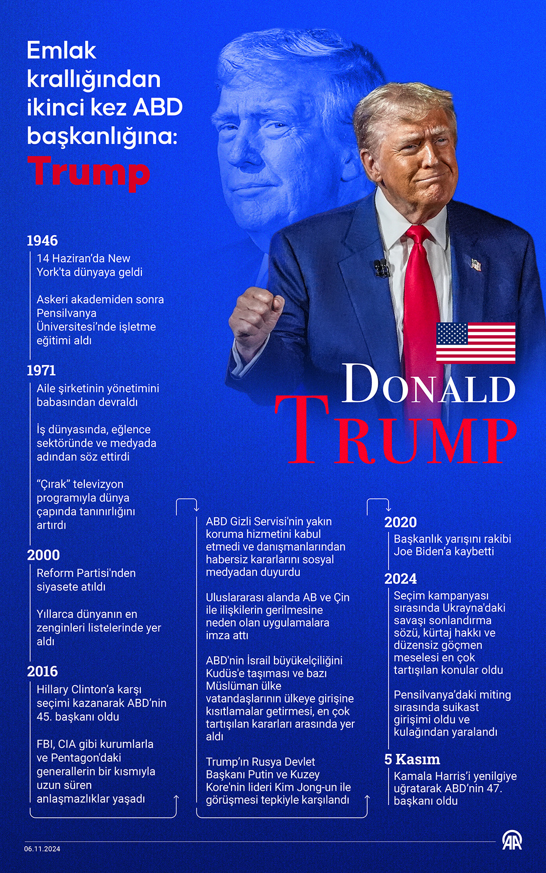 ABD’de başkanlık seçimlerinde resmi olmayan sonuçlara göre yarışı kazanan Donald Trump, Rusya-Ukrayna Savaşı'nda takınacağı tutumun yanı sıra hakkında açılan davalar ve yaptıklarıyla dikkati çekiyor. (Grafik:Muhammed Ali Yiğit/AA)06 Kasım 2024•Güncelleme: 06 Kasım 2024