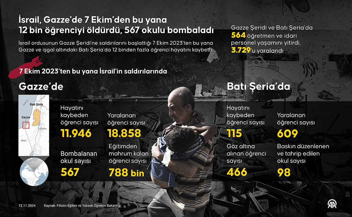 İsrail ordusunun Gazze Şeridi'ne saldırılarını başlattığı 7 Ekim 2023'ten bu yana Gazze ve işgal altındaki Batı Şeria'da 12 binden fazla öğrenci hayatını kaybetti.