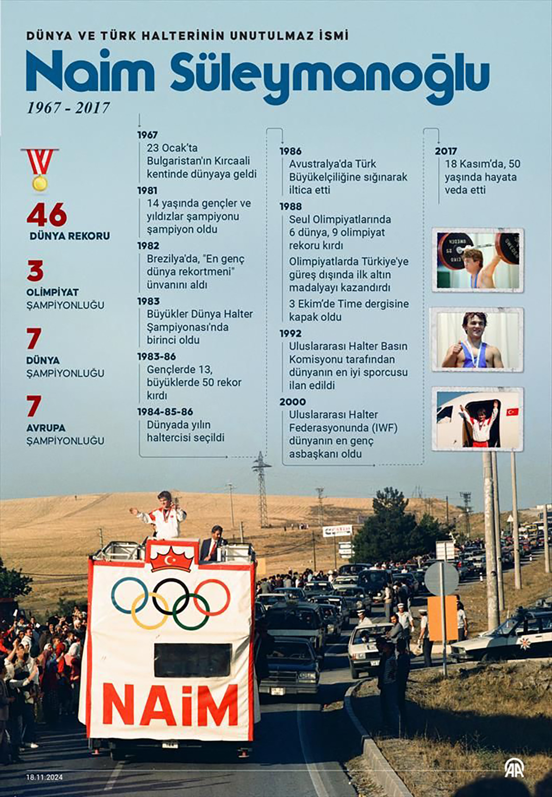 Naim Süleymanoğlu, halterde elde ettiği başarılarla dünyanın efsane sporcuları arasına adını yazdırmayı başardı. (Grafik: Muhammet Zeyd Karaaslan/AA)