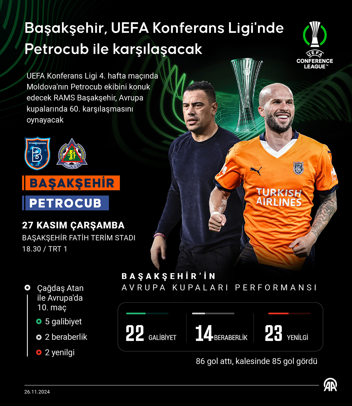 RAMS Başakşehir, UEFA Konferans Ligi dördüncü maçında sahasında Moldova'nın Petrocub takımıyla karşı karşıya gelecek. (Grafik: Kemal Delikmen/AA)