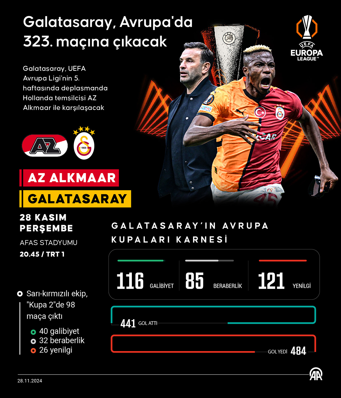 Galatasaray, UEFA Avrupa Ligi'nin 5. haftasında deplasmanda Hollanda temsilcisi AZ Alkmaar ile karşılaşacak. (Grafik: Kemal Delikmen/AA)